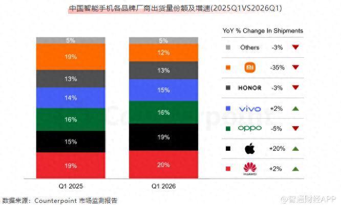Counterpoint Research的数据显示,华为在2026年第一季度以20%的市场份额领跑中国智能手机市场,创下2020年第四季度以来最高水平。一季度末畅享90系列出货进一步助力华为出货量同比增长2%。